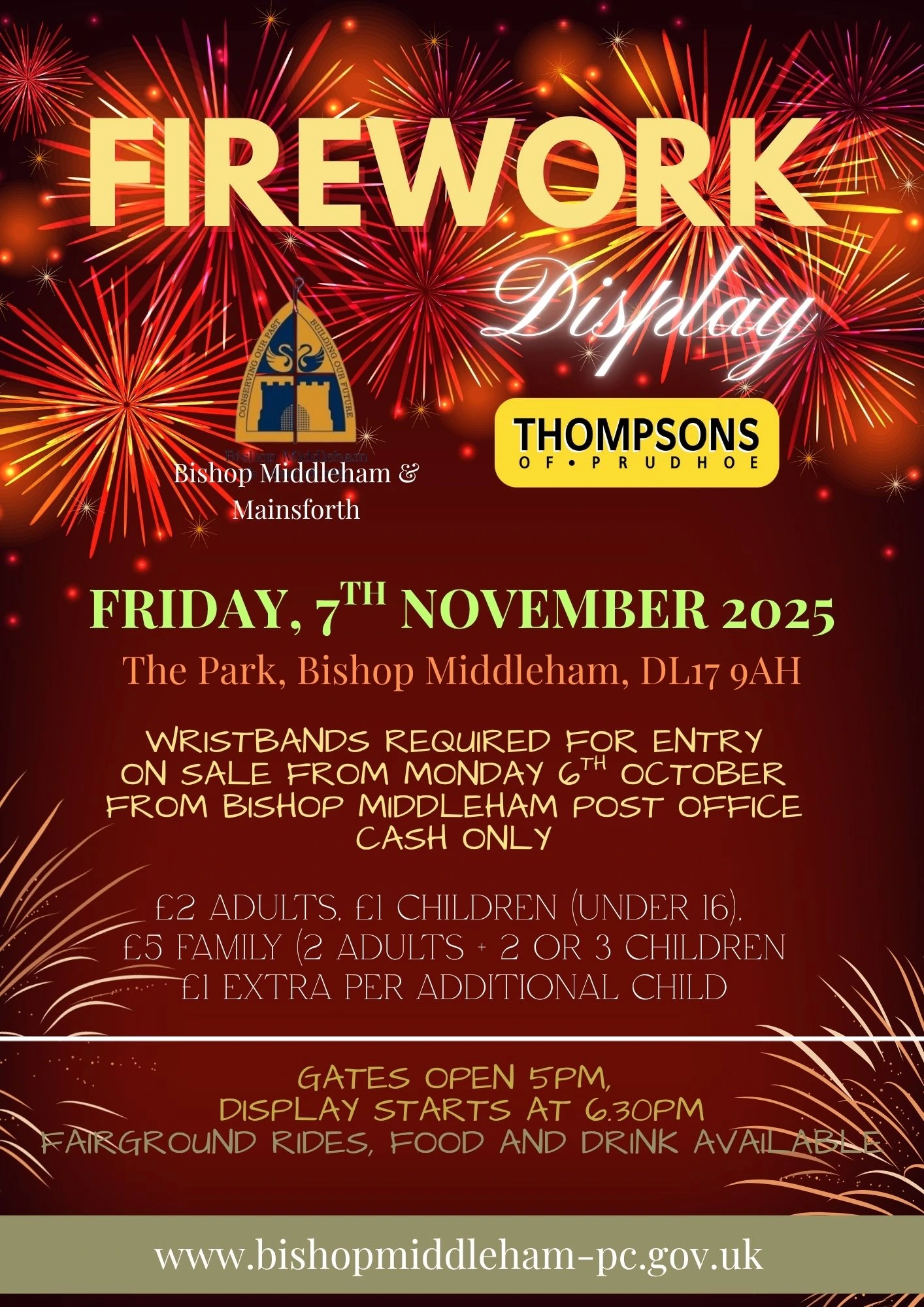 🎆 Firework Display – Friday 7th November 🎆 Get ready for a sparkling evening in Bishop Middleham! This year, wristbands are required to access the grounds for our firework display.